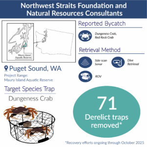 The Northwest Straits Foundation (NWSF) is a nonprofit based in Bellingham, Washington dedicated to protecting and restoring the Salish Sea by removing harmful derelict fishing gear, restoring vital marine habitats, and working with communities on shoreline stewardship. Since 2002, NWSF has worked with Natural Resources Consultants (NRC), a fisheries consulting firm that offers expertise on fisheries management, research, and collaborative solutions. Together, NWSF and NRC have removed more than 8,000 derelict crab pots and over 5,800 fishing nets.