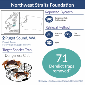 The Northwest Straits Foundation (NWSF) is a nonprofit based in Bellingham, Washington dedicated to protecting and restoring the Salish Sea by removing harmful derelict fishing gear, restoring vital marine habitats, and working with communities on shoreline stewardship. Since 2002, NWSF has worked with Natural Resources Consultants (NRC), a fisheries consulting firm that offers expertise on fisheries management, research, and collaborative solutions. Together, NWSF and NRC have removed more than 8,000 derelict crab pots and over 5,800 fishing nets.