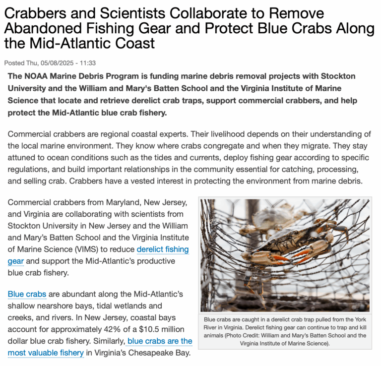 CLICK TO READ – Crabbers and Scientists Collaborate to Remove Abandoned Fishing Gear and Protect Blue Crabs Along the Mid-Atlantic Coast