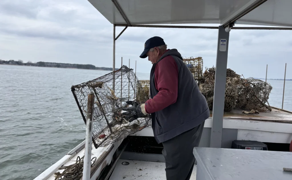 Waterman E.C. Hogge removes an abandoned crab pot in the York River on Monday, Feb. 10, 2025. (image credit - Katherine Hafner / WHRO News)